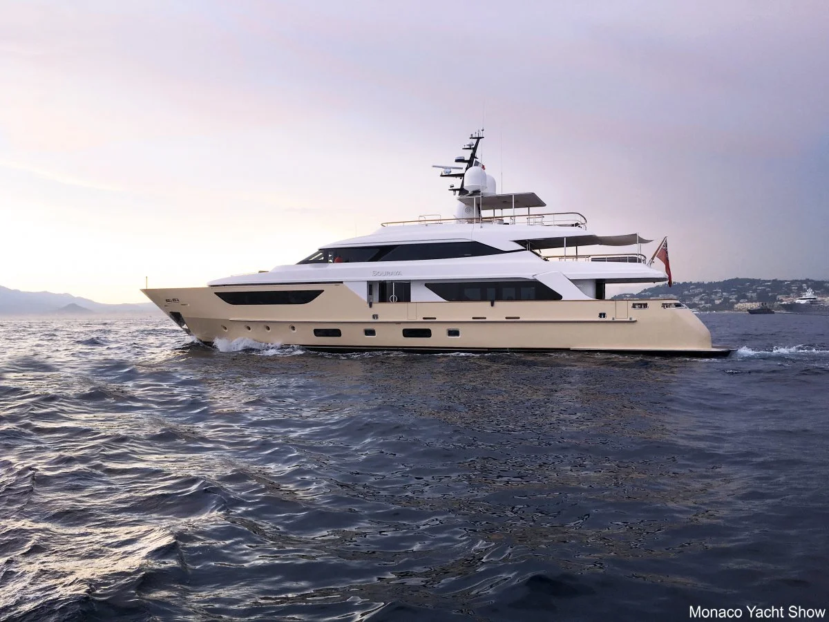 Large luxury yacht named Cyclone measuring 43.7 meters, floating on the water against a partly cloudy sky, with the Monaco Yacht Show logo in the corner.