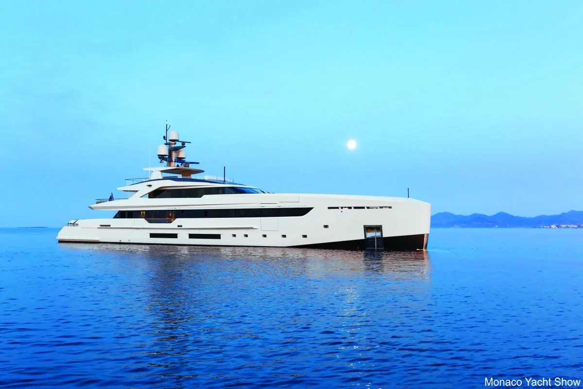 A large black and white yacht on calm ocean waters with a landmass and hills in the background, labeled 'Monaco Yacht Show'.